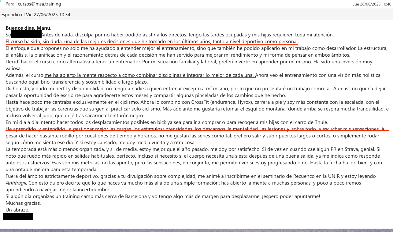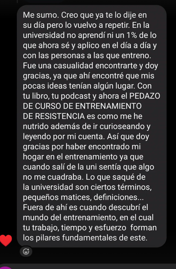 Maravillosa formación en todos los sentidos. Todo, absolutamente todo, está medido para que las piezas encajen en este puzzle gigante que es el entrenamiento. Ponentes de gran nivel, clases claras, concisas, bien fundamentadas, con rigor, pero no llenas de una verborrea hueca y difícil de seguir, temas de actualidad y conocimientos teóricos bajados hasta el día a día. Y luego está Manu, un grande, el coreógrafo de todo esto, alguien que tiene tantos conocimientos como modestia y sencillez. Debate abierto a través del chat de Telegram con compañeros de gran nivel y con el propio Manu que solo aumentan la calidad de la formación. Para mí, que no tengo formación universitaria en ciencias del deporte, ha sido un salto enorme en cuanto a conocimientos. No te lo pienses, de verdad. No te vas a equivocar.